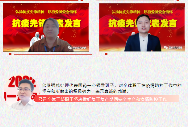 两名抗疫先锋代表的发言,更体现了国药一心全体职工在疫情面前的责任与担当,他们为公司取得疫情防控和保供达产的双胜利始终努力着、奋斗着,践行着“我为一心谋发展,一心为我谋福祉”的企业文化理念。