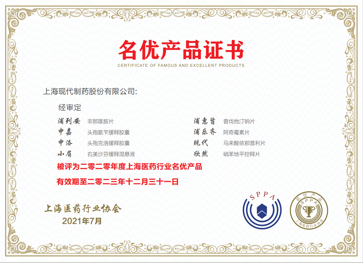 现代-名优产品证书(8个产品)-上海医药行业协会