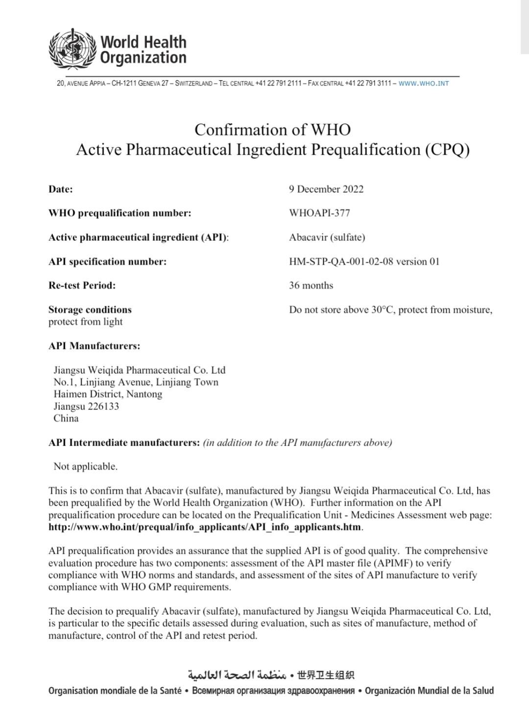 近日,国药现代子企业江苏威奇达药业有限公司(以下简称“国药江苏威奇达”)收到世界卫生组织(以下简称“WHO”)出具的PQ(预认证)确认函[Confirmation of WHO Active Pharmaceutical Ingredient Prequalification(CPQ)](以下简称“CPQ证书”),证书编号:WHOAPI-377。