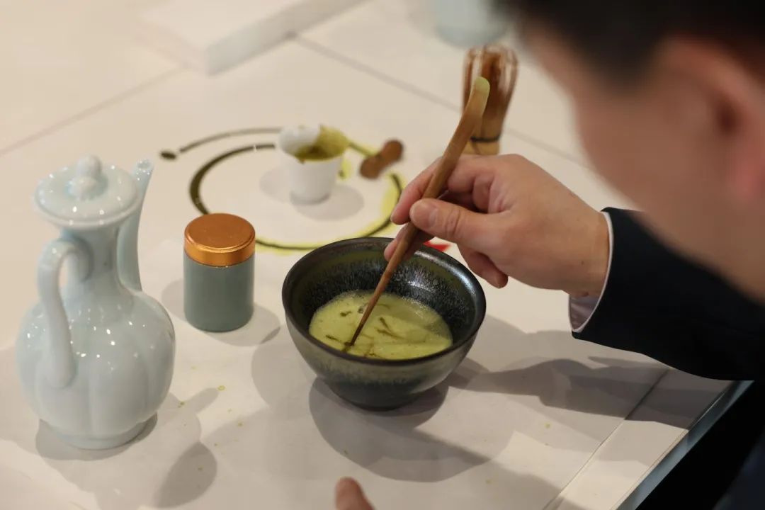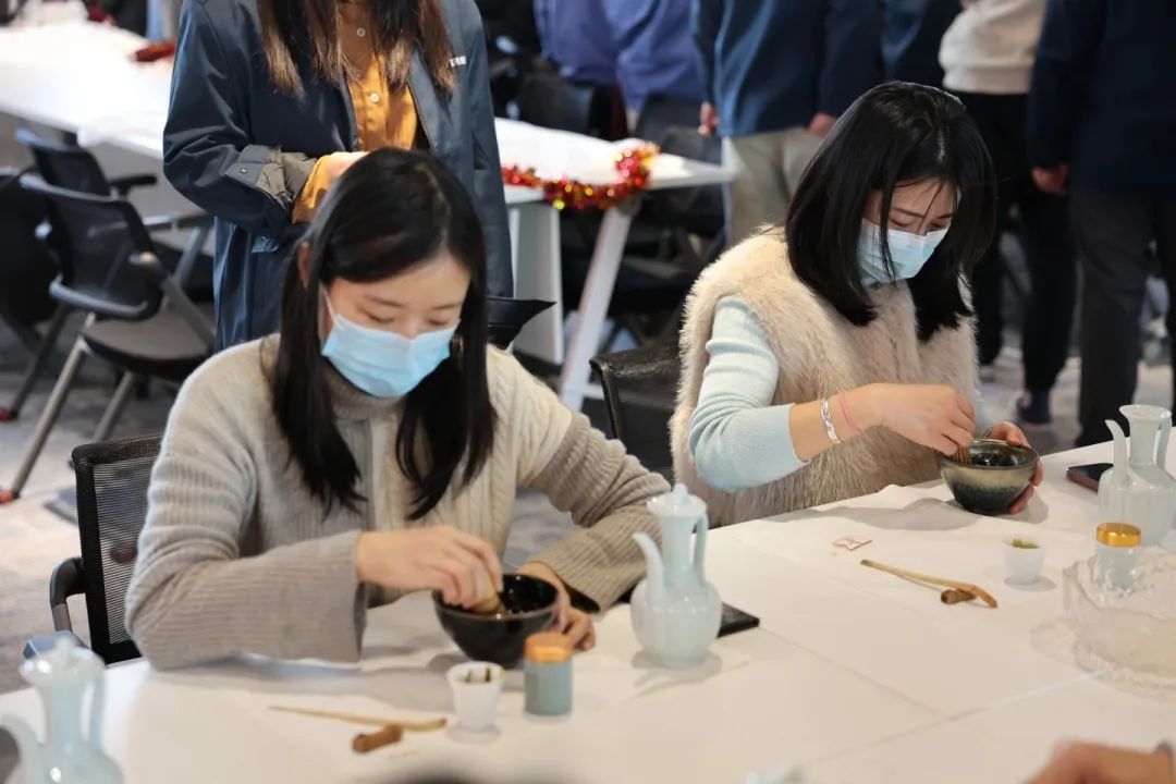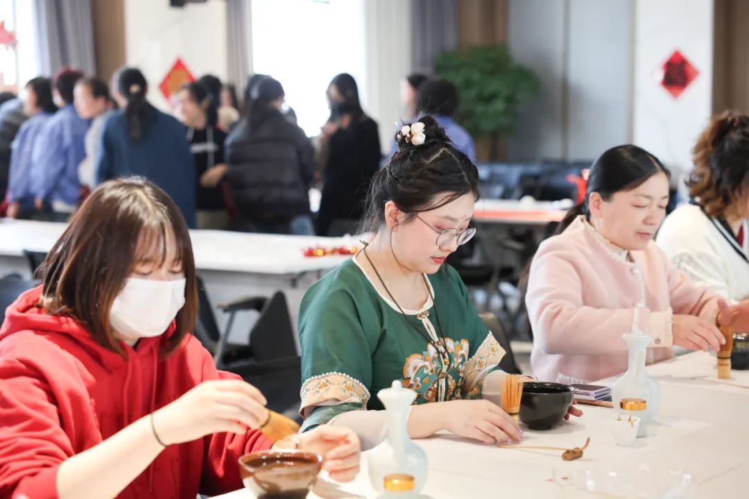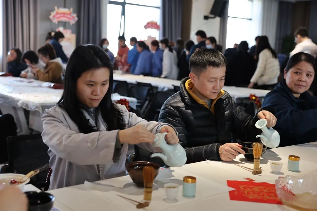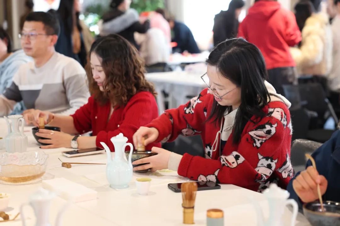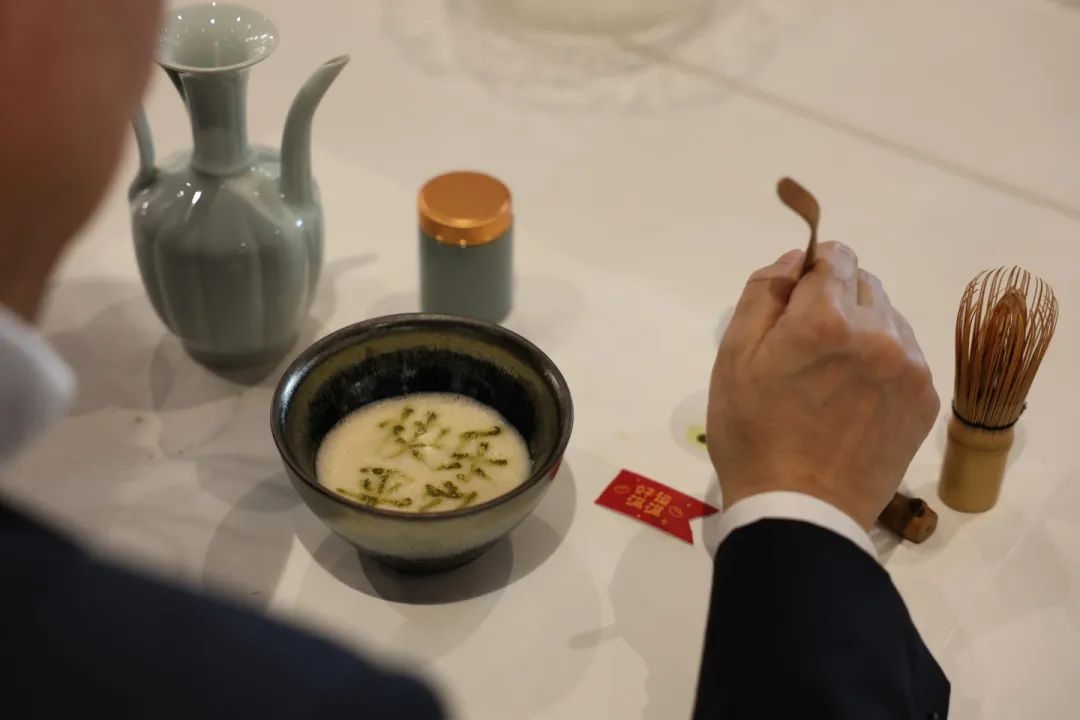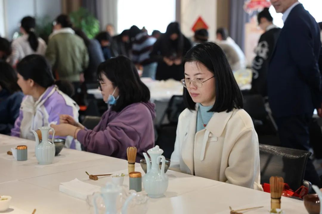 宋韵点茶区,茶艺师们身着传统服饰,手法娴熟地以古法点茶,吸引着对茶艺饶有兴趣的员工们。