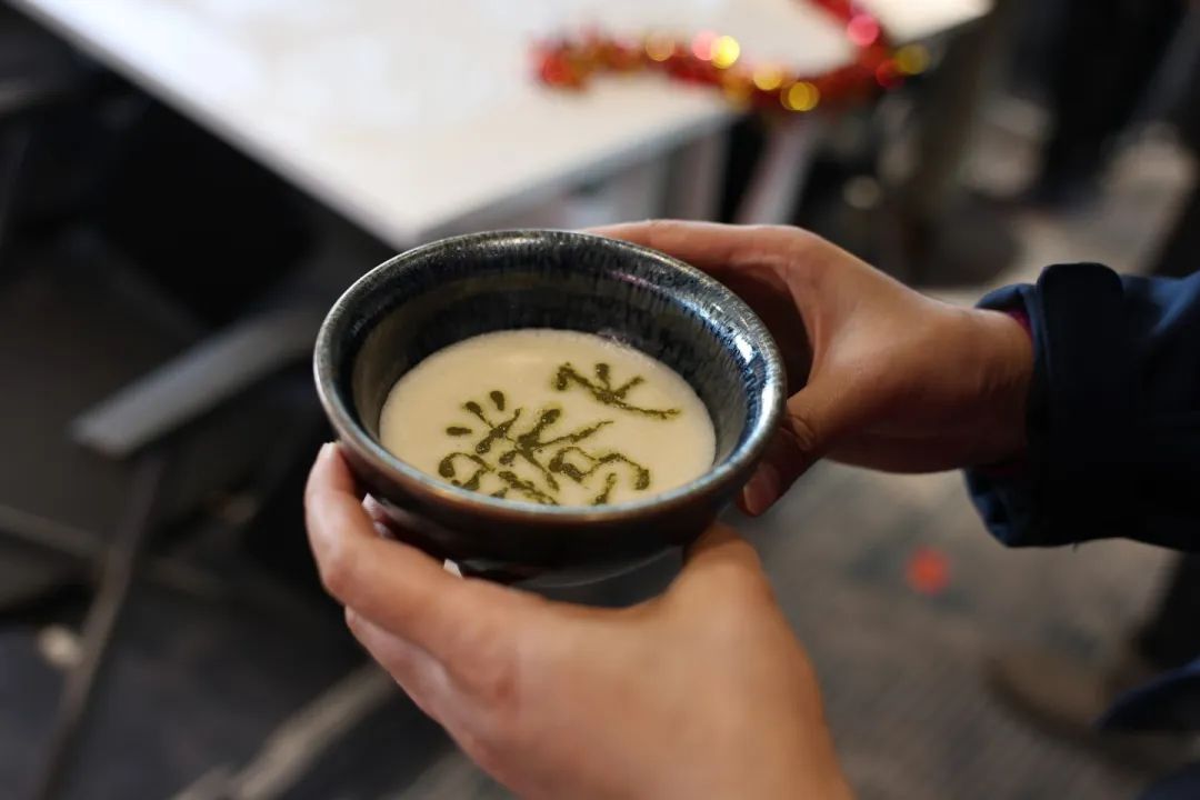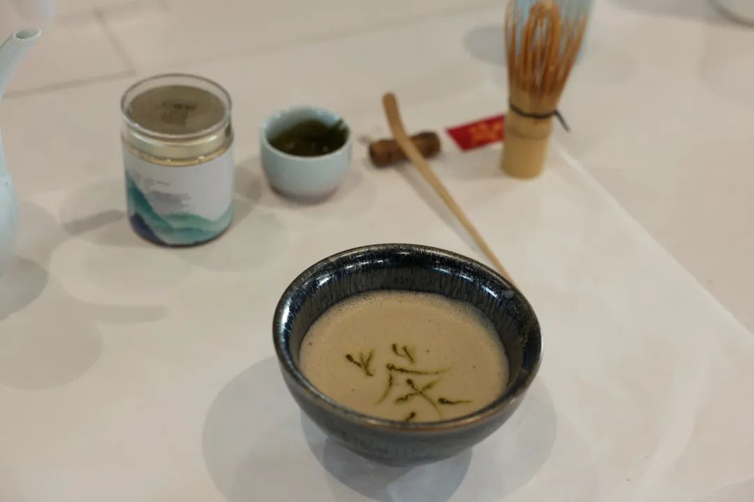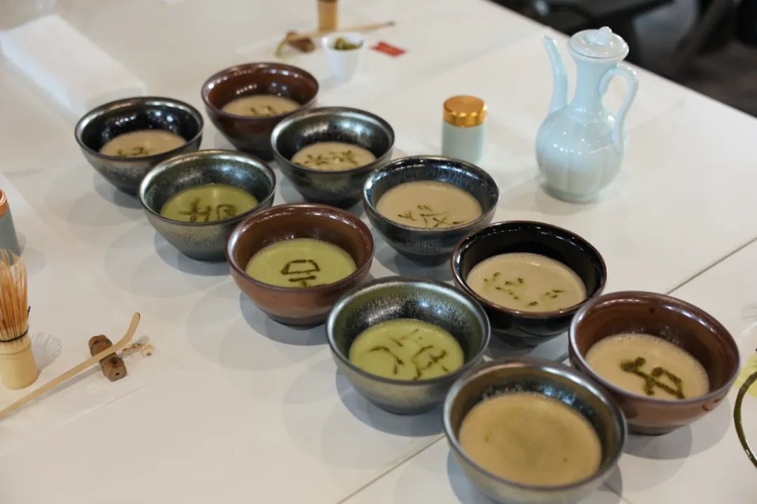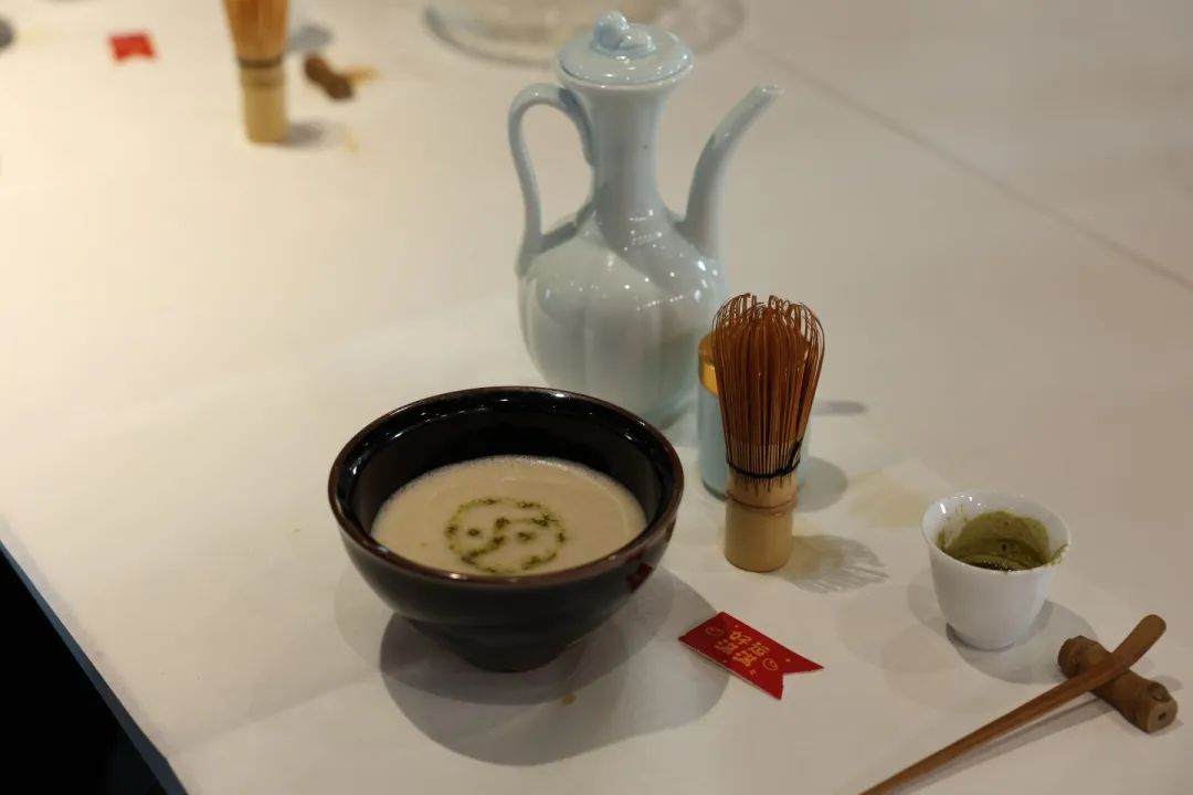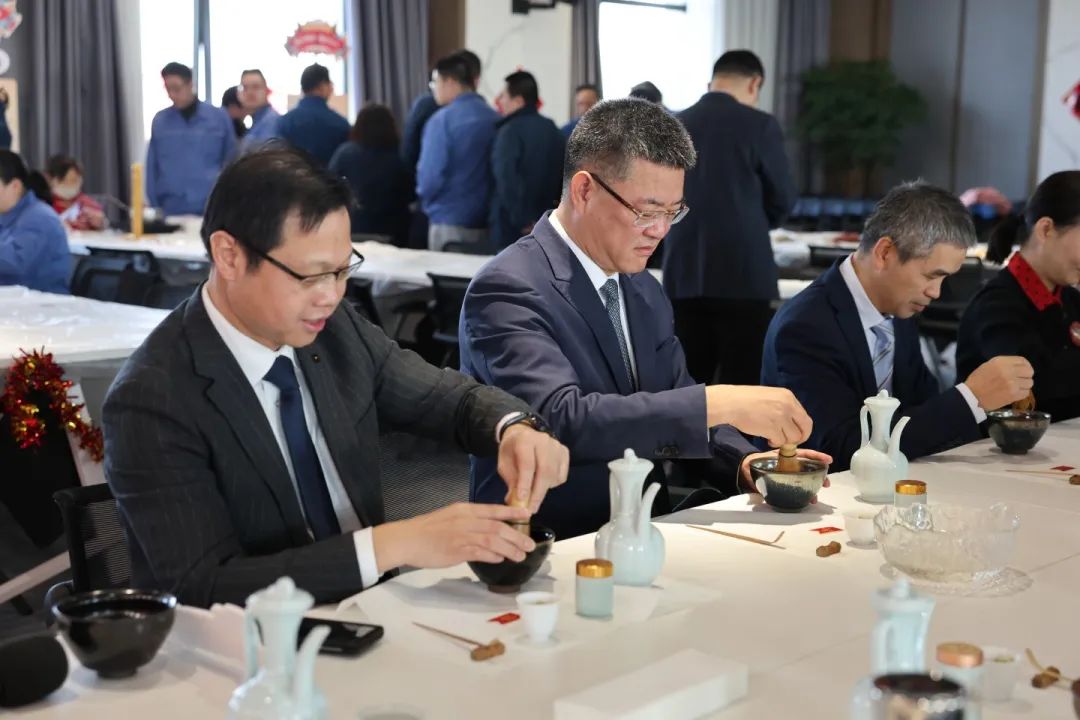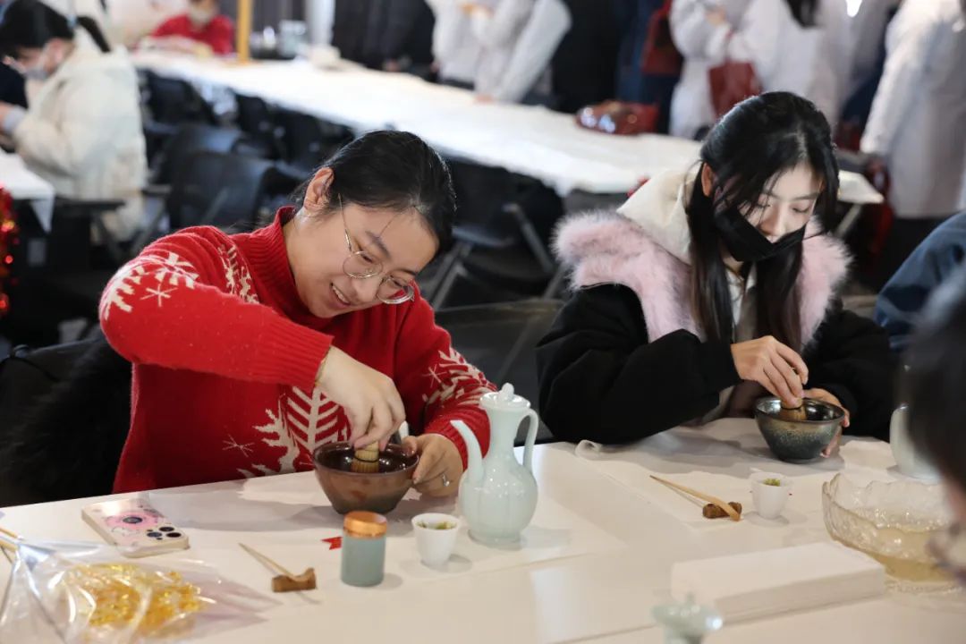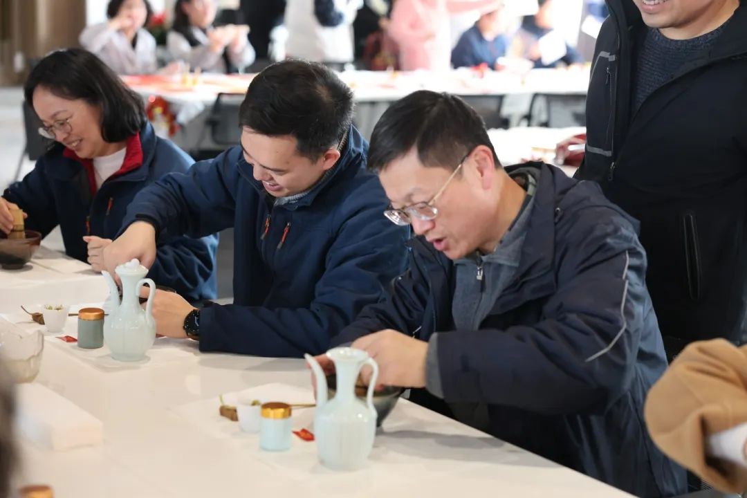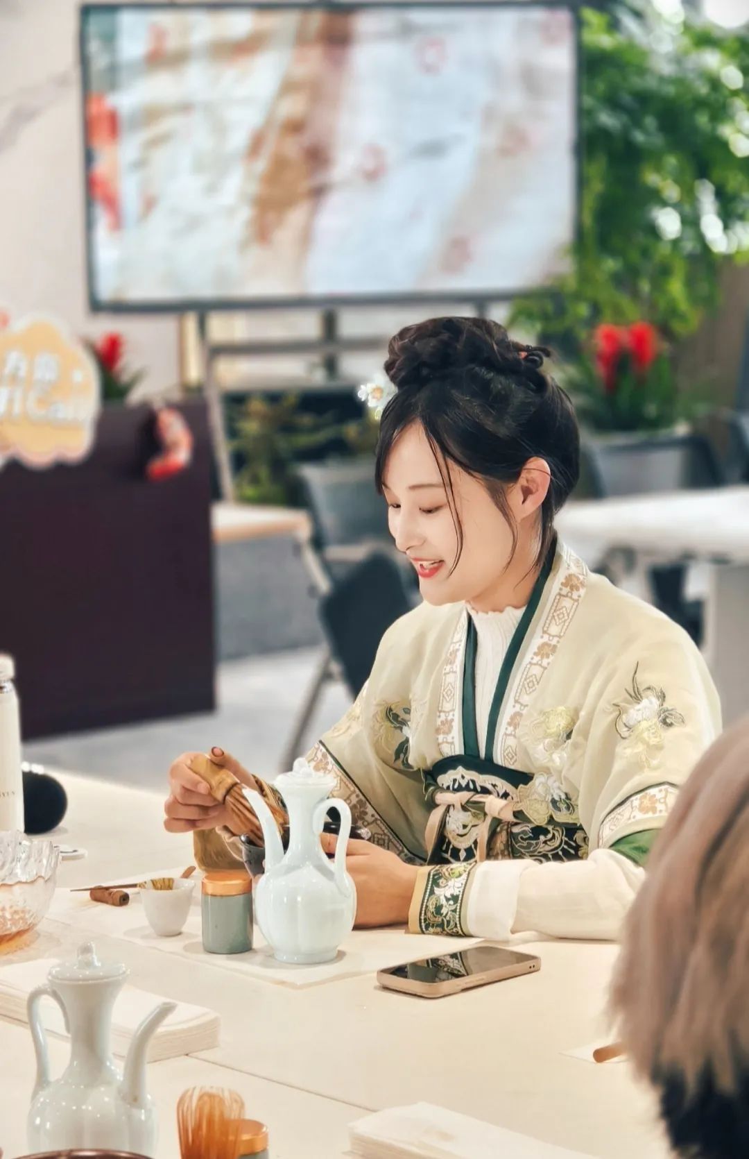 宋韵点茶区,茶艺师们身着传统服饰,手法娴熟地以古法点茶,吸引着对茶艺饶有兴趣的员工们。