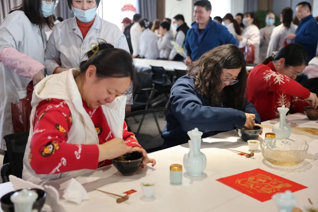 冰糖葫芦制作体验区,红火甜蜜的糖葫芦吸引着员工们排起了长长的队伍,粘上热腾腾的糖水,感受甜蜜的年味。