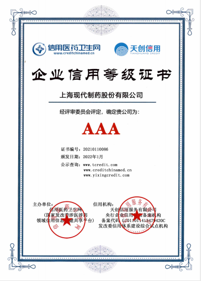 现代-2022年度制药行业企业信用等级证书AAA级-信用医药...