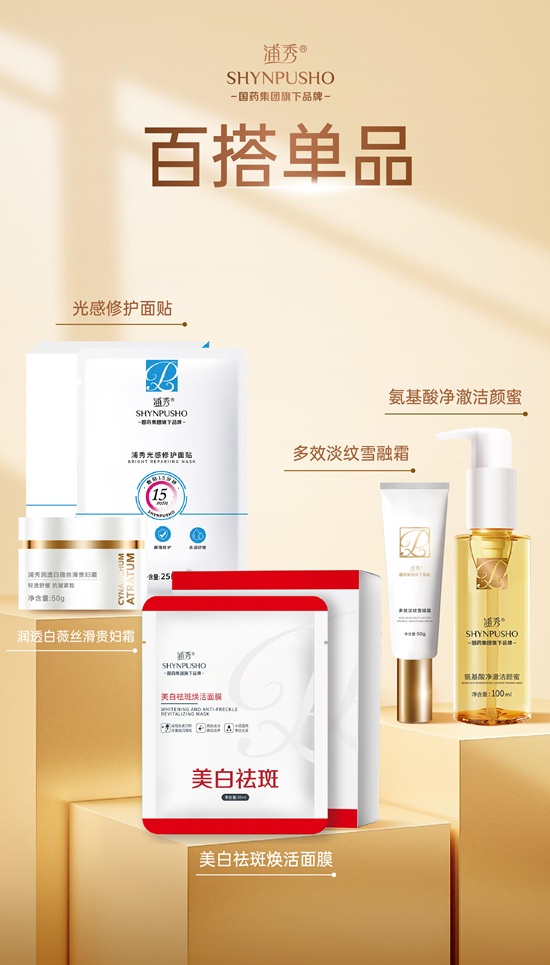产品包括氨基酸净澈洁颜蜜、润透白薇丝滑贵妇霜、光感修护面贴、多效淡纹雪融霜、美白祛斑焕活面膜等