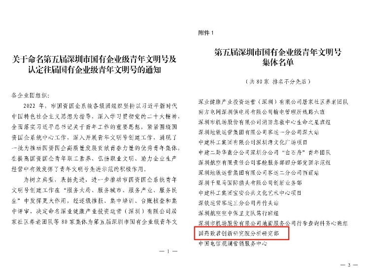以青春之名义,吹响“青年文明号”。近日,第五届深圳市国有企业级青年文明号集体名单发布(共80家),国药致君创新研究院分析研究部光荣上榜!