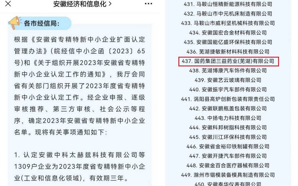 根据《安徽省专精特新中小企业扩面认定管理办法》(皖经信中小企函〔2023〕65号)和《关于组织开展2023年安徽省专精特新中小企业认定工作的通知》,经企业申报、逐级审核推荐、第三方审核、社会公示等程序,8月30日,安徽省经济和信息化厅公布2023年度安徽省专精特新中小企业名单(工业和信息化领域),国药集团三益药业(芜湖)有限公司被认定为2023年度省专精特新中小企业(工业和信息化领域),有效期三年。